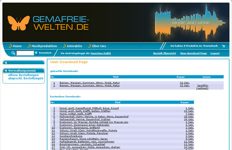 Auf der User Download Page kann jeder Kunde, der bei GEMAfreie Welten registriert ist, auf ein Produkt zurückgreifen, was er bereits erworben hat. Des Weiteren erhält jeder registrierter Benutzer bei uns ein Geräuschearchiv, auf das er jederzeit Zugreifen kann. Im Gegensatz zu anderen Anbietern bleiben die Soundinhalte in der User Area gespeichert und sind jederzeit zugreifbar. Allerdings muß man sich vorher kurz mit dem Benutzernamen und Passwort einloggen.